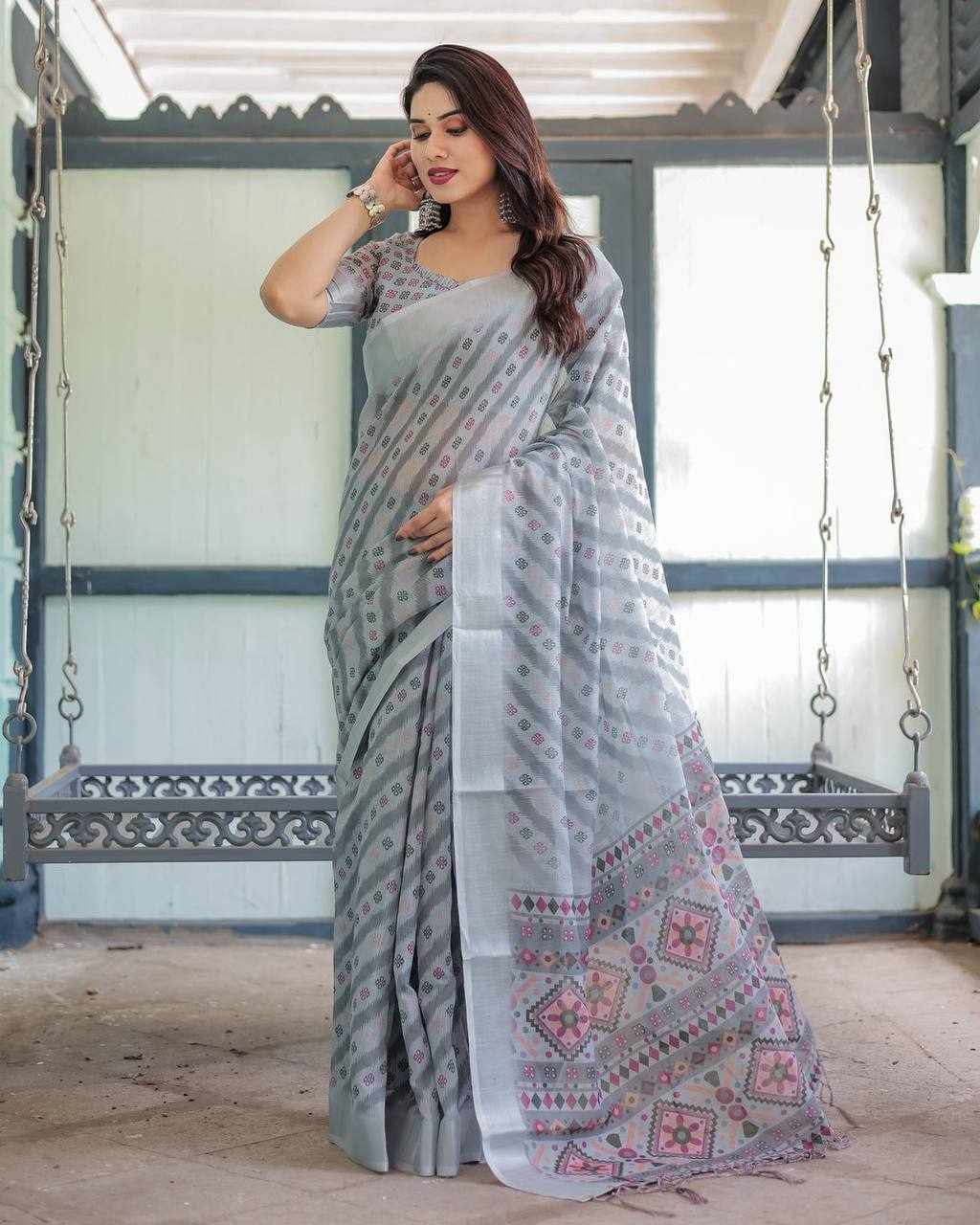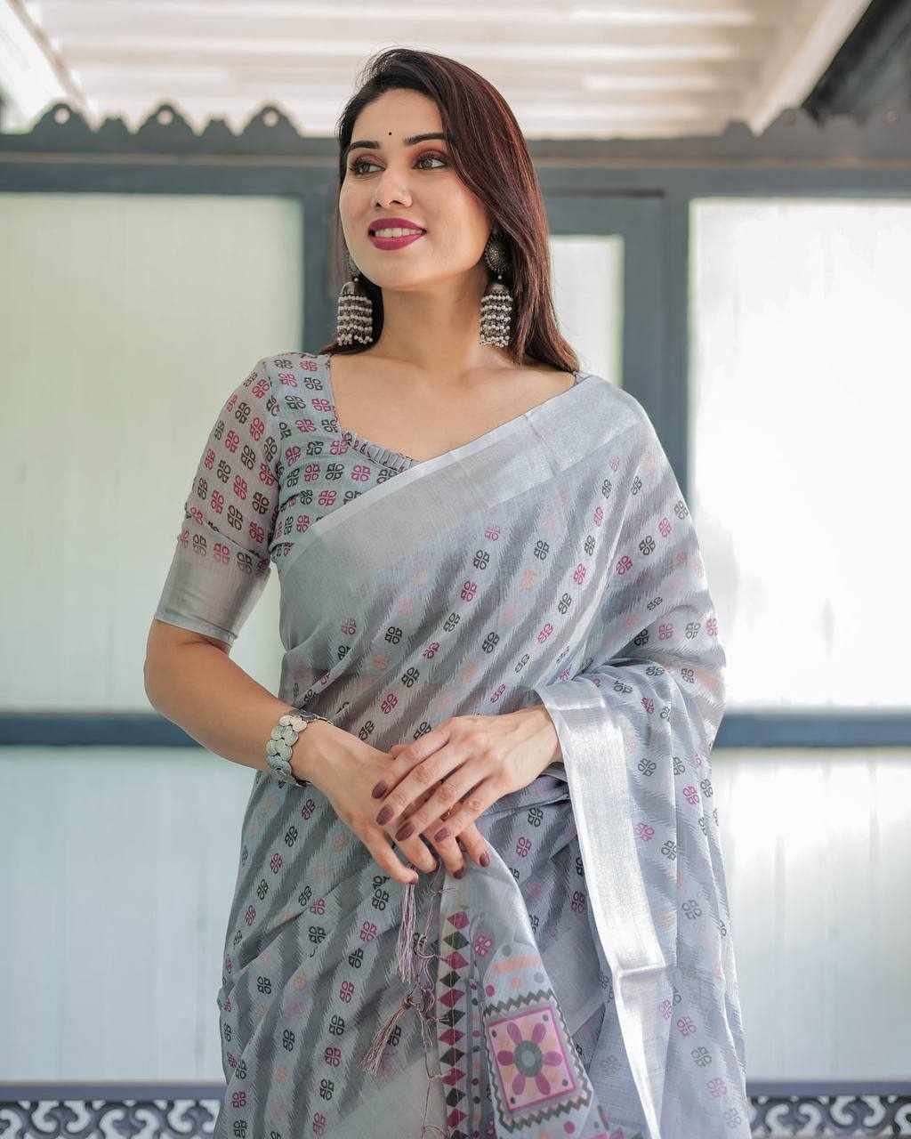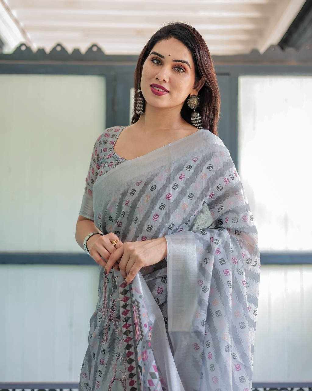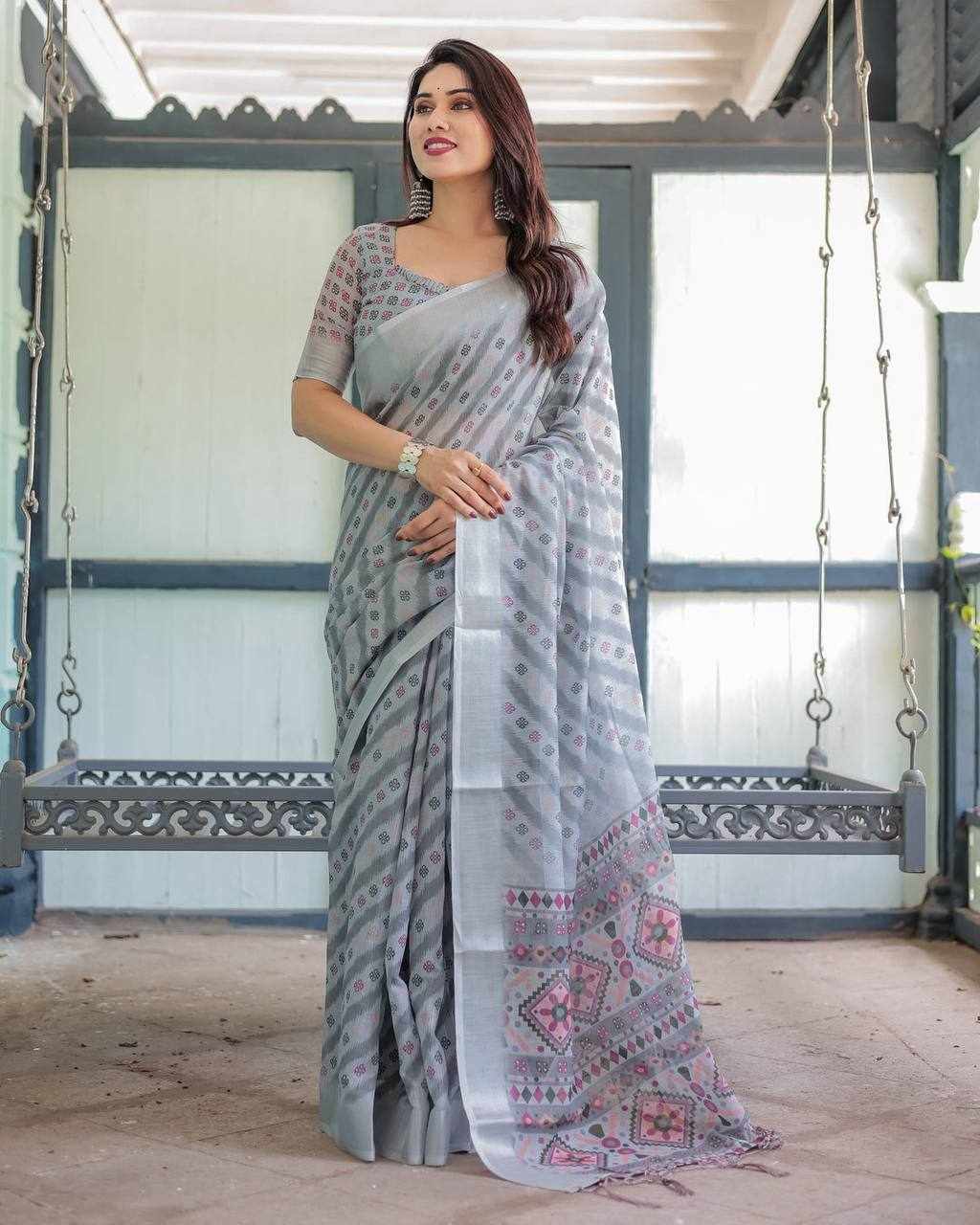 Premium Silver Weaving Linen Cotton Saree